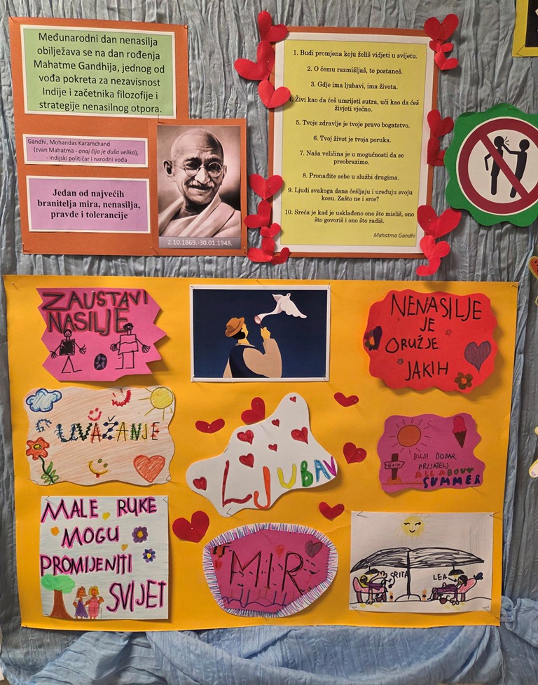 Povratkom u klupe nakon ljetnog odmora, učenici u Programu preventivnih i izvannastavnih aktivnosti od 1.-4. razreda vrijedno su radili  na temi o Međunarodnom danu nenasilja, koji se obilježava 2.listopada svake godine na dan rođenja Mahatme Gandhija, vođe indijskog pokreta za neovisnost, začetnika filozofije i strategije nenasilja.