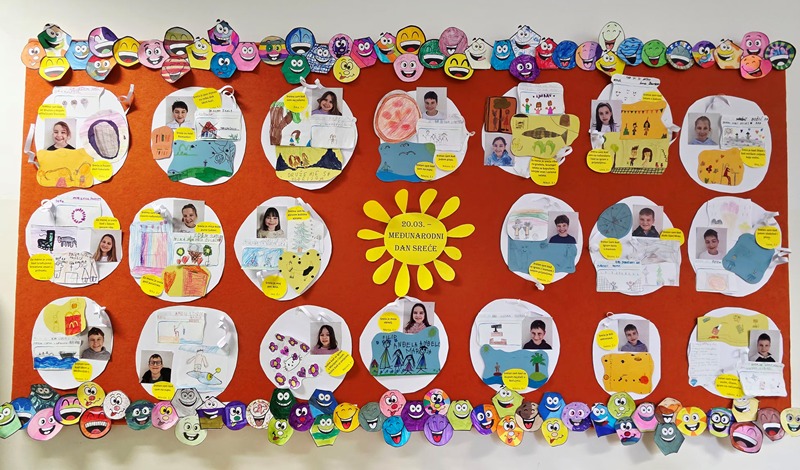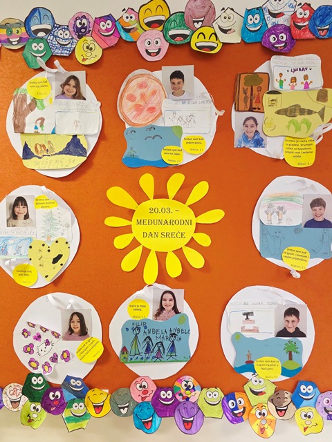 Stoga je ovaj dan, 22.ožujka – Međunarodni dan sreće, prilika za zastati i razmisliti o stvarima koje nas uistinu čine sretnima, te koliko je zaista malo potrebno za sreću. Učenici su to vjerno dočarali svojim radovima koje smo izložili na panou, a samo mali dio slijedi u nastavku: